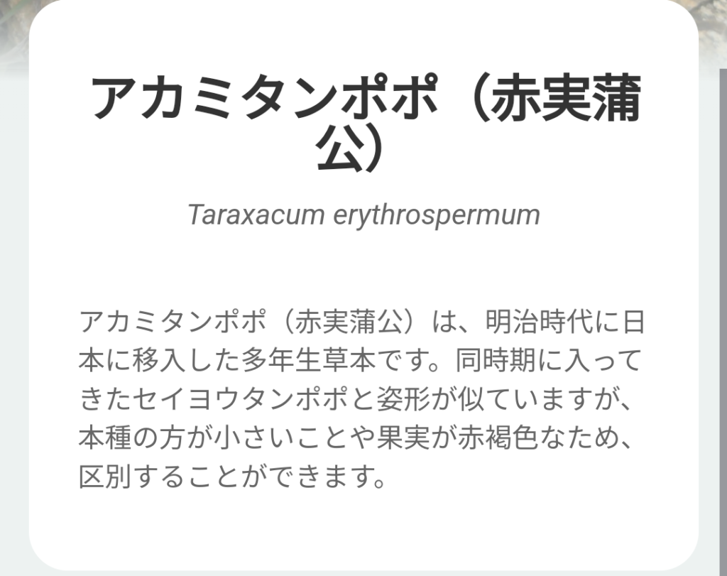 HOME > 発見 > 自然を学ぶ > 自然を学ぶ アカミタンポポ 2024年4月12日 調査ポイント付近で発見。 見つけた時に、おーっ!たんぽぽゲットだぜ!といつものごとく知ってる花を見つけると嬉しくなりながら撮影した。しかしこれまたいつものごとくたんぽぽはたんぽぽでもセイヨウタンポポとは違う種類のものだった。 知っている植物を見つけた時は、いつもどこか分かっていない部分がある。 安易に知った気になるのは何でもよくないね。 さぁ次はどんな自然と出会うかな。スポンサーリンク picturethisより引用 共有: クリックして X で共有 (新しいウィンドウで開きます) X Facebook で共有するにはクリックしてください (新しいウィンドウで開きます) Facebook クリックして Pocket でシェア (新しいウィンドウで開きます) Pocket 関連 Twitter Share Pocket LINE -自然を学ぶ -植物