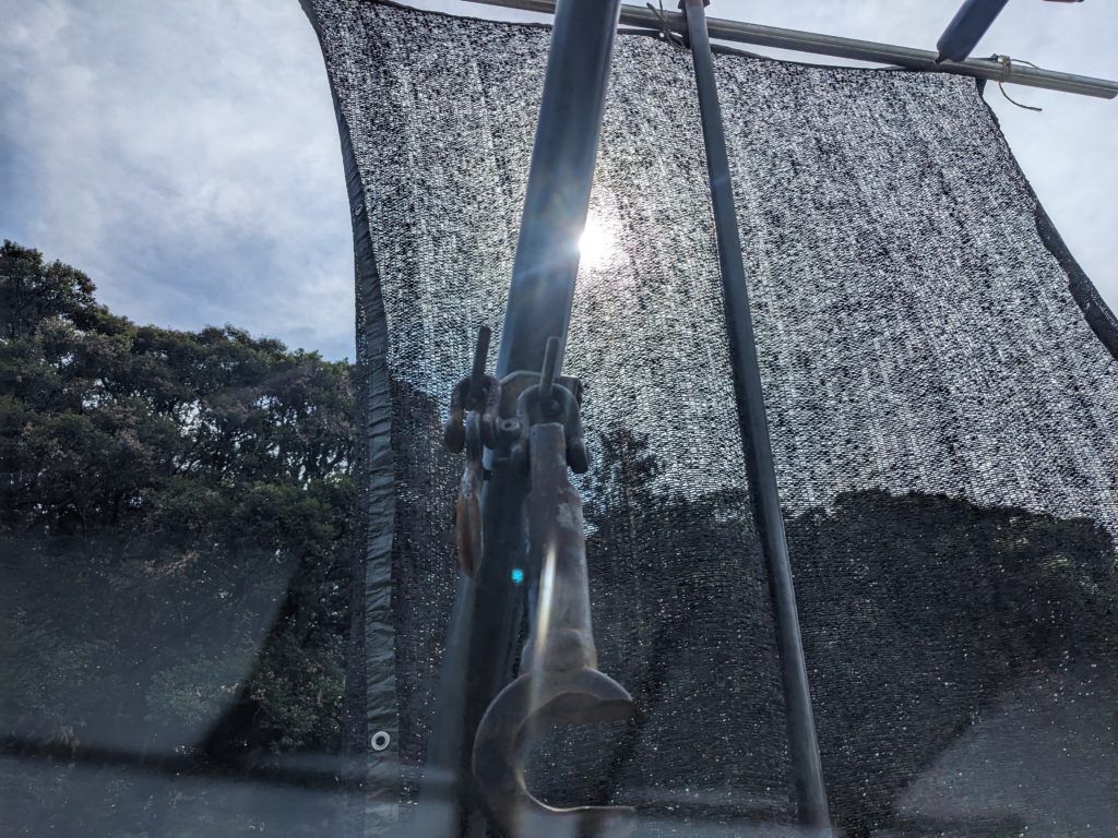 6月末から遮光ネットを3m傾斜計パイプに取り付けたものを用意していて、ずっと使う機会を見てましたが、今日やっと使うことができました。