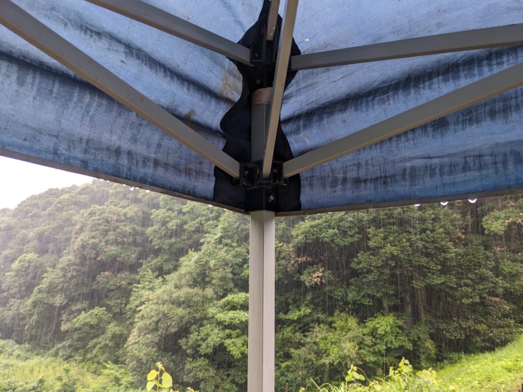 それでも長くても15分位待てば勢いが収まるようなレベルだったので、大雨のときはテント下で休憩して、収まってきたら作業開始するような動き方で作業していました。