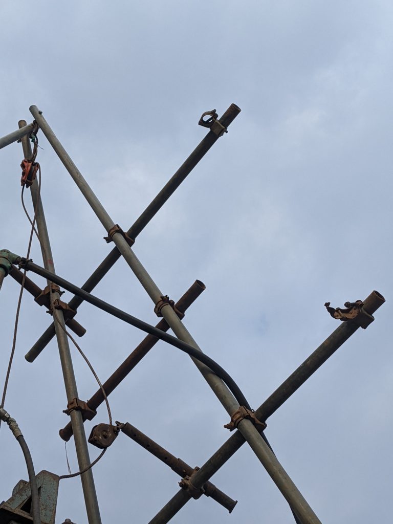 たくさんの方に教えていただいたことを活かして、自分の現場に合わせたやり方を考えて再度現場で三脚櫓上部の仮設を行いました。