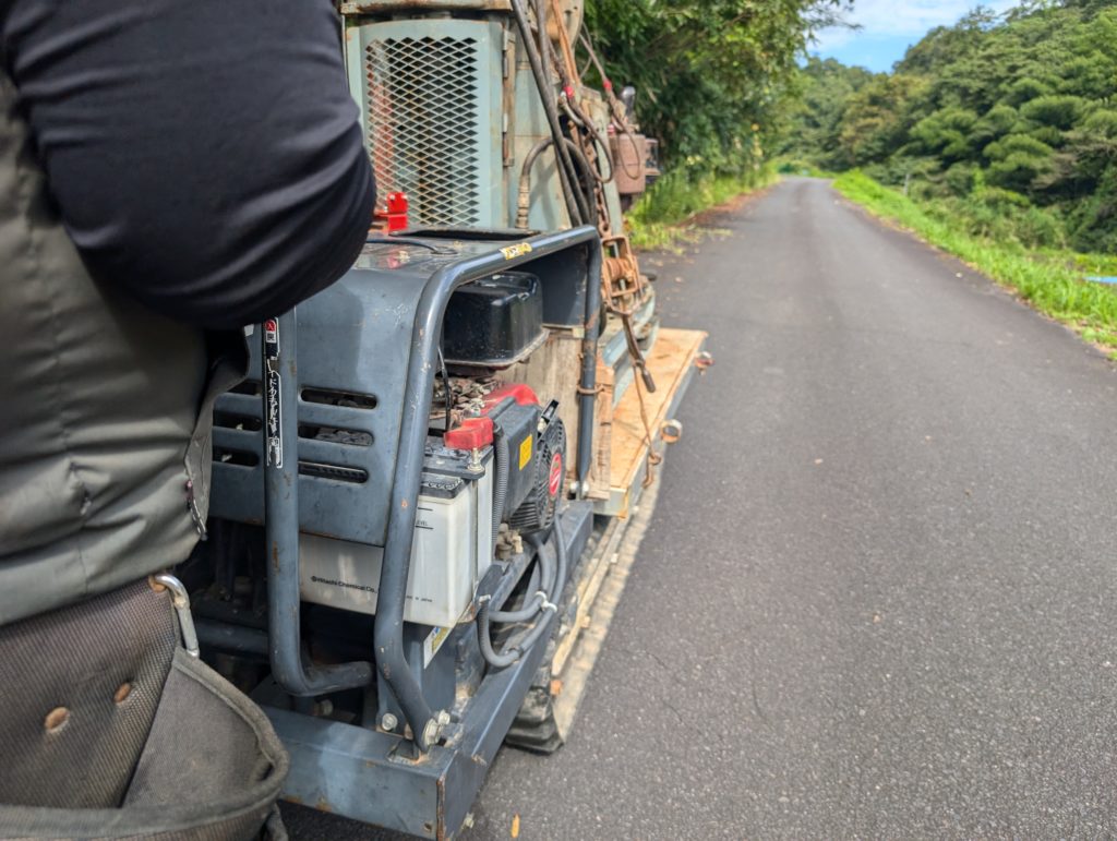 軽トラとクローラで運搬して足場組んで仮設して半ペネ半コアで掘削していきます。