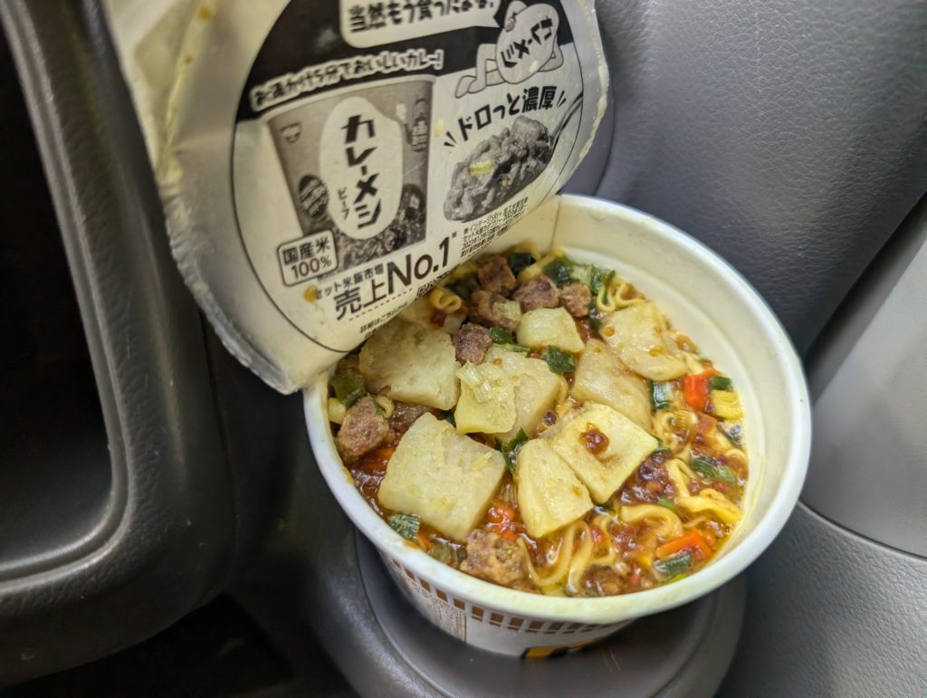 昼飯。白ご飯は弁当箱に詰めて持っていき、おかずはコンビニで悩んで悩んでカップヌードルカレー。