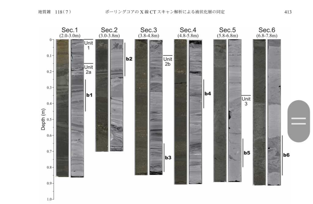 ボーリングコアの X 線 CT スキャン解析による東北地方太平洋沖地震における地盤液状化層の同定という技術報告書があったので、そのデータの中の画像を引用させていただきます。