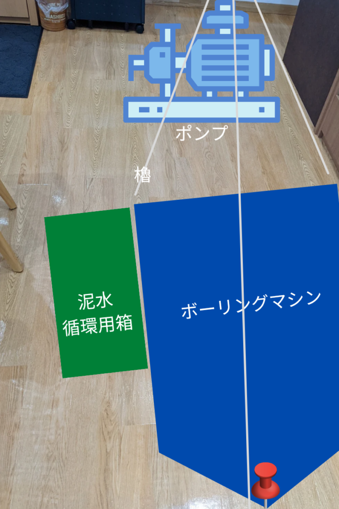 掘削中にもしポンプ圧を上昇させ過ぎたりホースが破れたら泥水が飛び散る可能性もあるのでポイント周辺の棚や机もシートで養生しようかな。