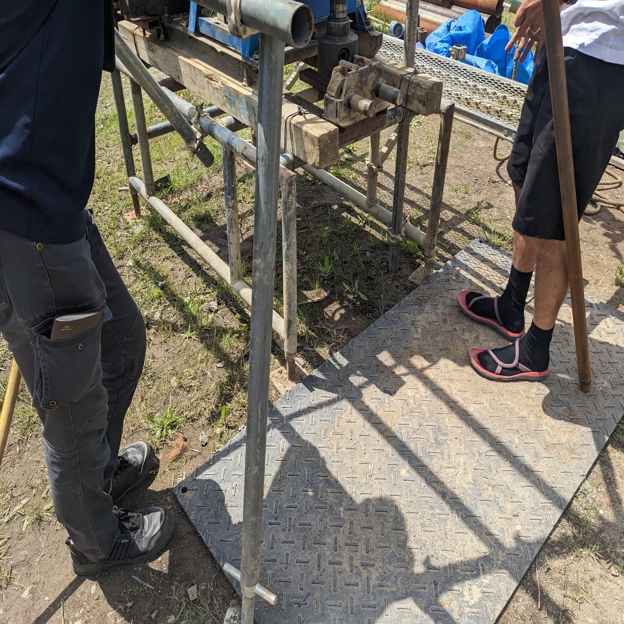 演習会場に到着してまずはりんぼさんに前日に準備していただいた機械の仮設方法や使用している道具を見ながらメンバーで意見交換をしました。