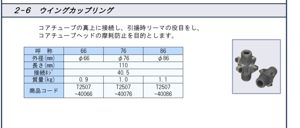 コアチューブ上部にはウイングカップリングという摩耗防止や裸孔時にリーマーの役割をする道具が取り付けてありました。