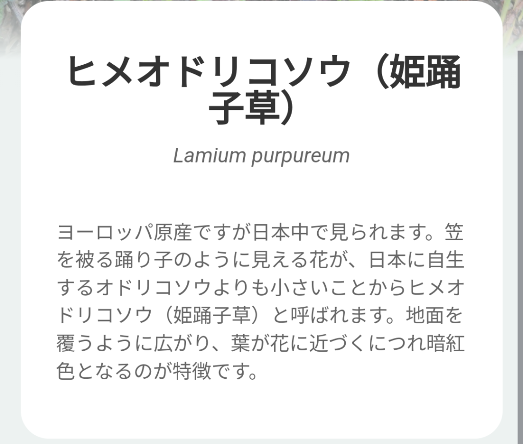 HOME > 発見 > 自然を学ぶ > 自然を学ぶ ヒメオドリコソウ(姫踊子草) 2024年3月12日 picturethisより引用 会社の敷地で発見。 自然を学ぶシリーズでは初めてのカラフルな植物である。 外来種のようだ。日本原産はこれより大きくオドリコソウというものがあるんだって。 それからこうして自分が見つける植物は繁殖力や拡散力の強いのつよい害草と呼ばれるものが多いみたいだ。 引き続きこうやって植物をゆっくり覚えていくつもりだ。スポンサーリンク picturethisより引用 共有: クリックして X で共有 (新しいウィンドウで開きます) X Facebook で共有するにはクリックしてください (新しいウィンドウで開きます) Facebook クリックして Pocket でシェア (新しいウィンドウで開きます) Pocket 関連 Twitter Share Pocket LINE -自然を学ぶ -植物