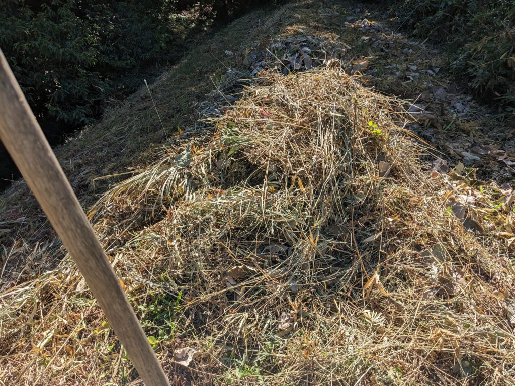 現場到着して検尺準備してから検尺まで時間があったので、熊手を持って次の池に歩いて行き、刈ってある草を片付けた。