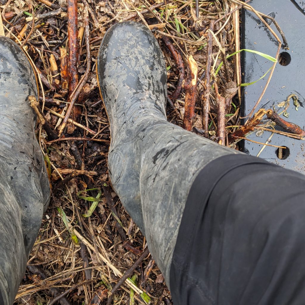 現場に到着して後ろのドアを開けてドアの下で着替える。 仕事の流儀ではないが、1日雨の日はカッパのズボンの裾は絶対に長靴の外に出すのが僕のお決まりだ。
