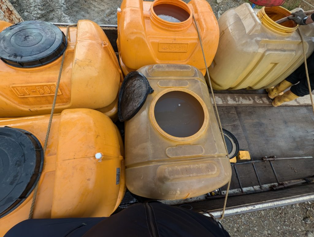 仮設が完了したら、掘削に使う作業用水を建設現場の作業用水が貯水してある池でユニックに積んできた500Lのタンク×5に給水します。