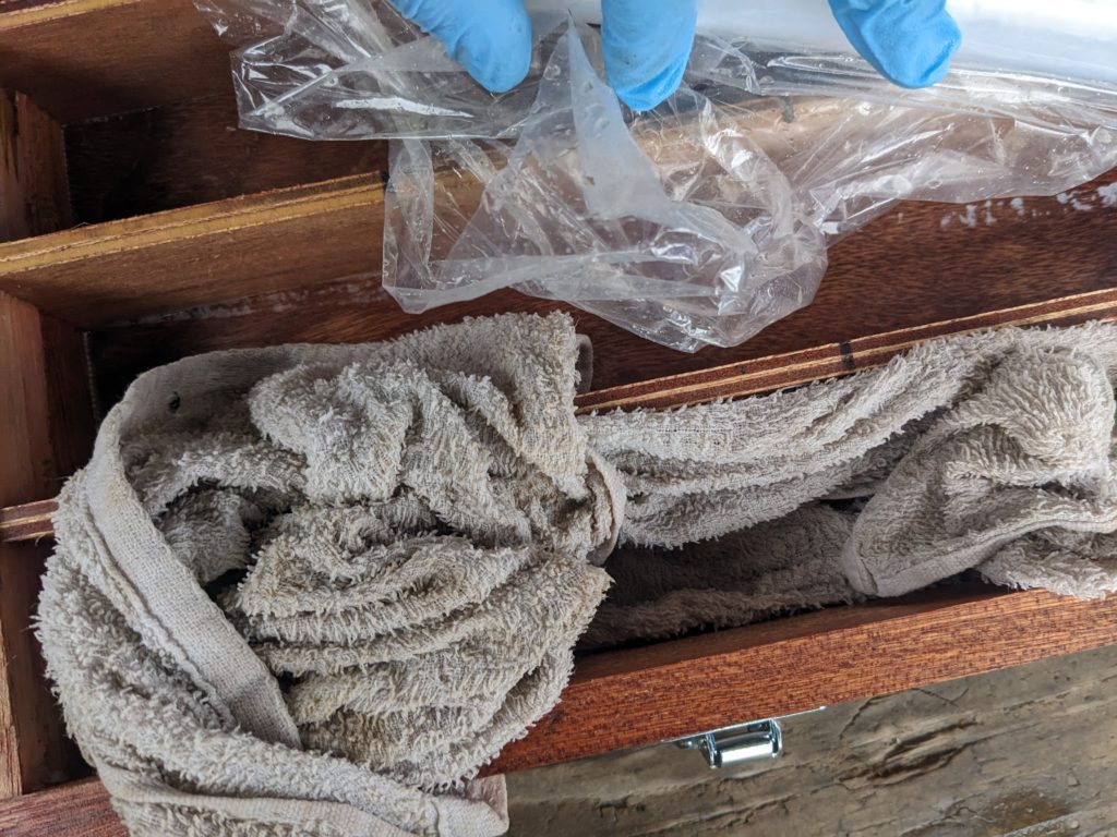 現場終わりにコア箱を養生するためにシートをかけて帰ったのですが、雨の量が多かったことや、シートが新しいものではなかったので撥水力が弱かったことが原因で濡れてしまいました。