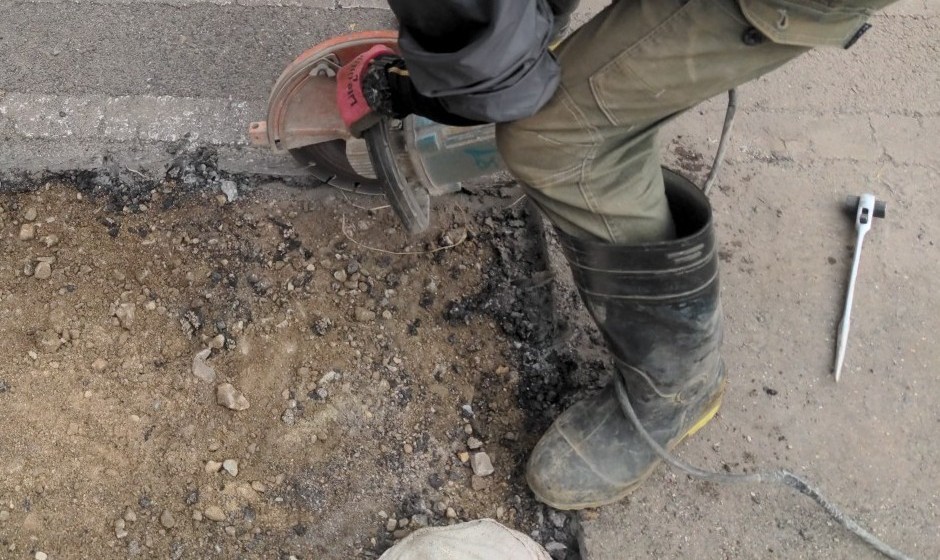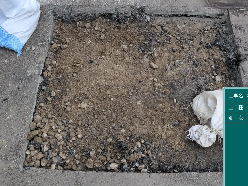 アスファルト舗装の場合、まずはボーリングマシンでアスファルトに穴を開けてから試掘をするか、他の道具でアスファルトを取り除いてから試掘をはじめます。