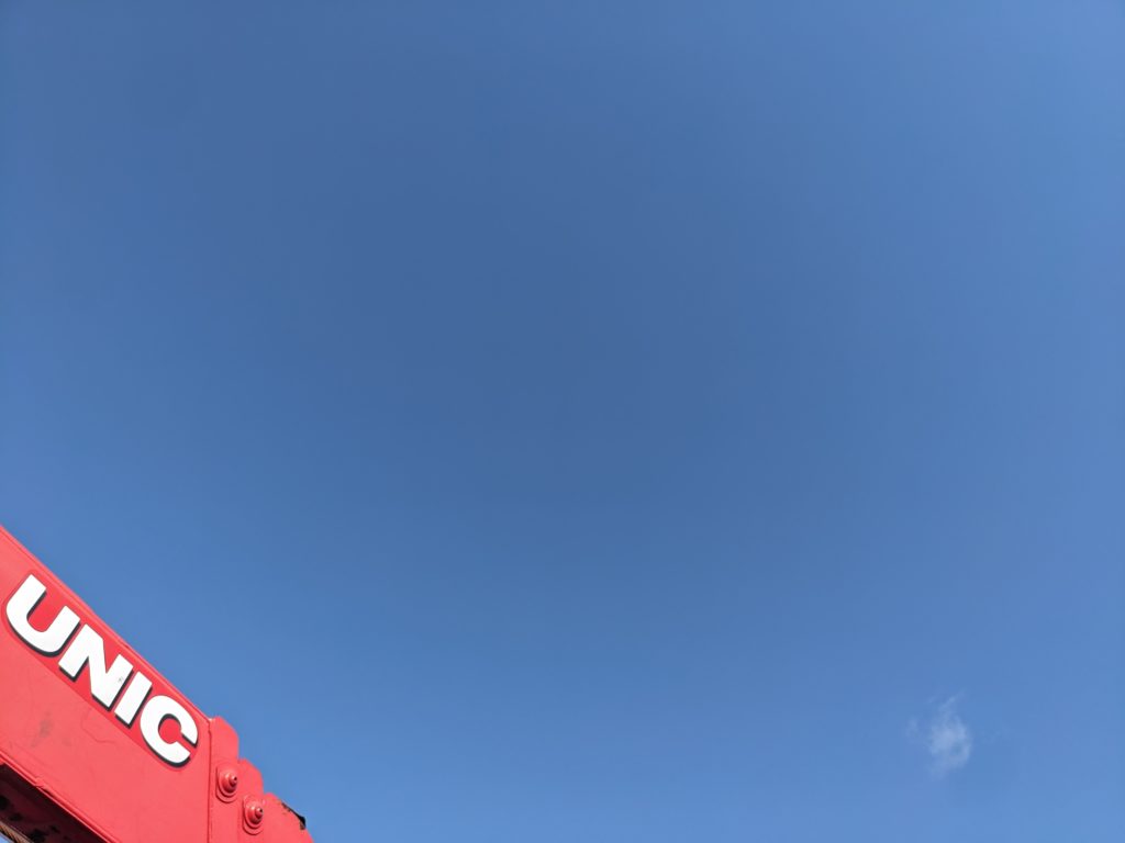 ユニックを車庫から出し、次のポイントで使うための足場材を積み込んだ。