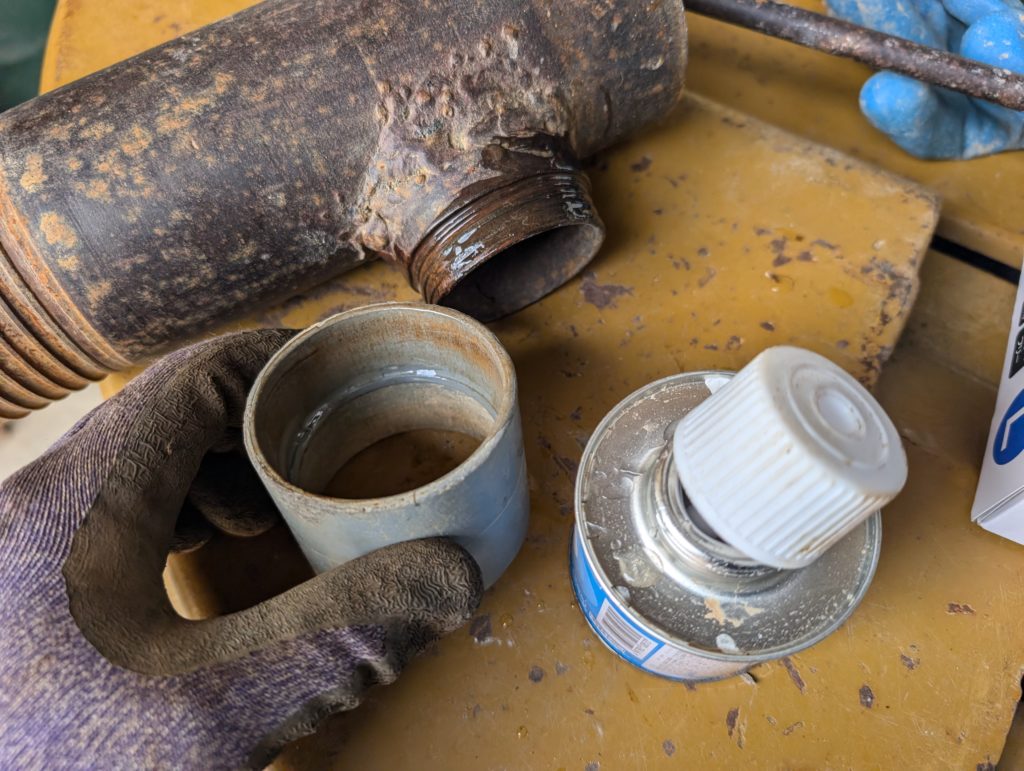 こちらは掘削水を排水するためのチーズなのですが、最近ネジが摩耗してきてうまく取り付けられなくなってしまったので、パイプジョイントにボンドを付けて取り付けて修理しました。