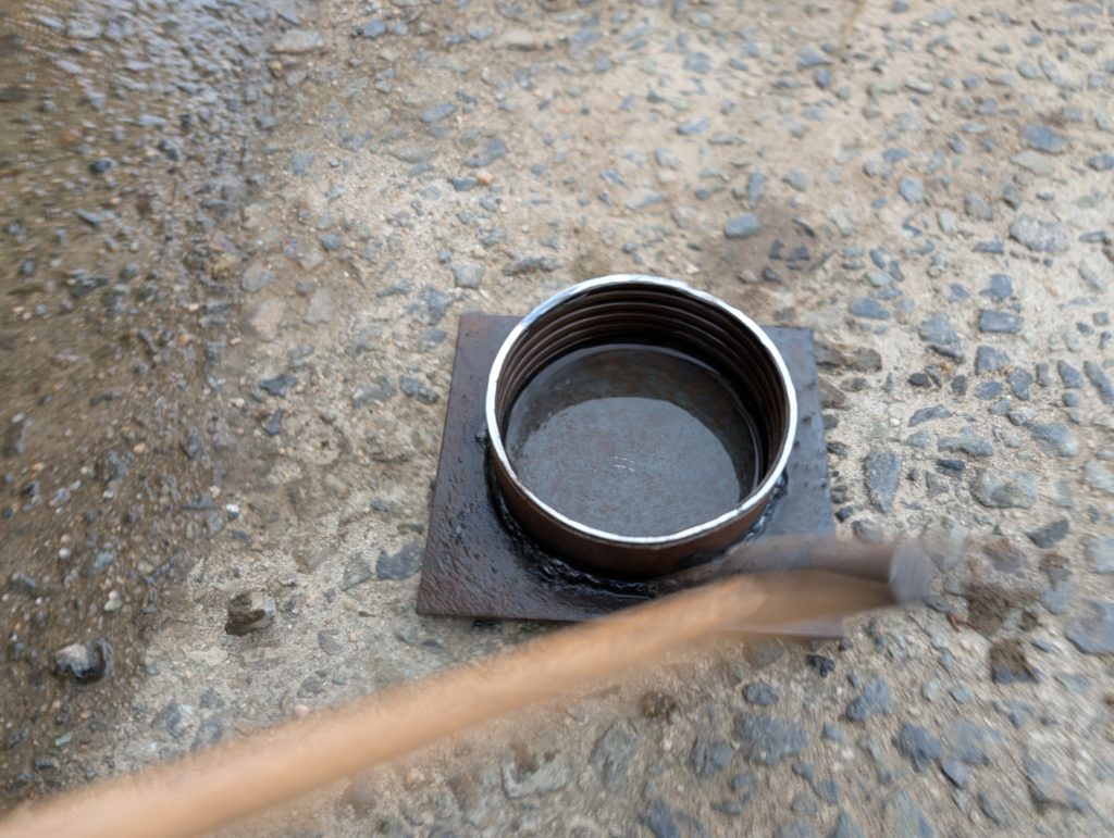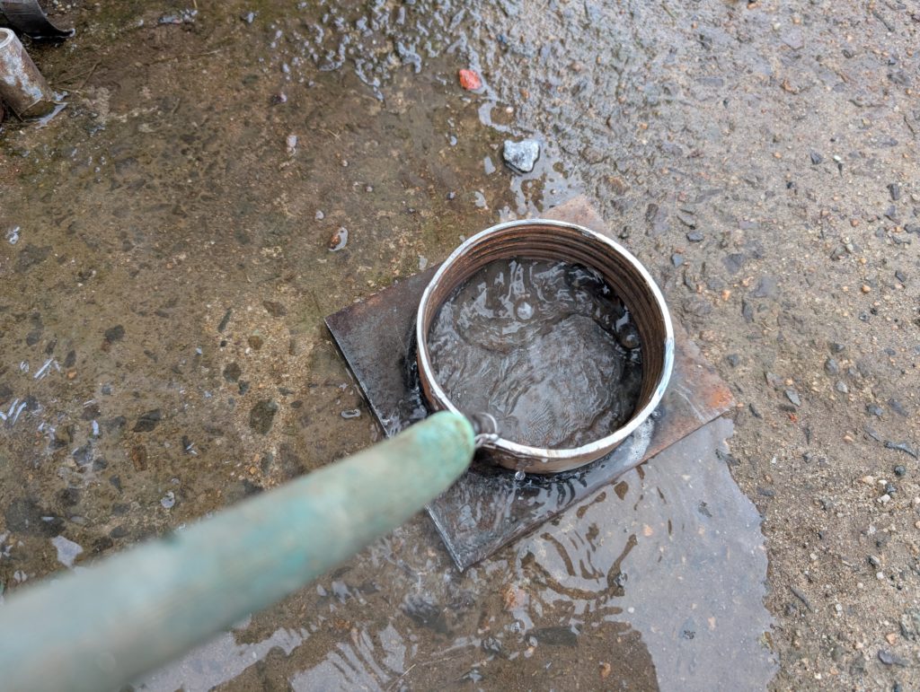 溶接した後は溶接で発生した、熱で熱々状態の治具に水をかけて冷ます。