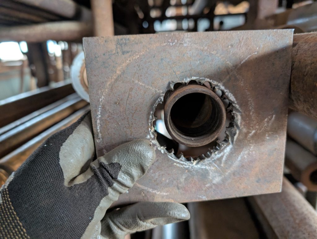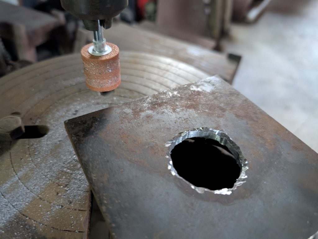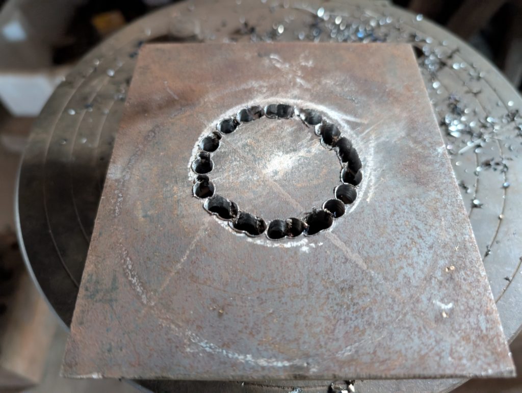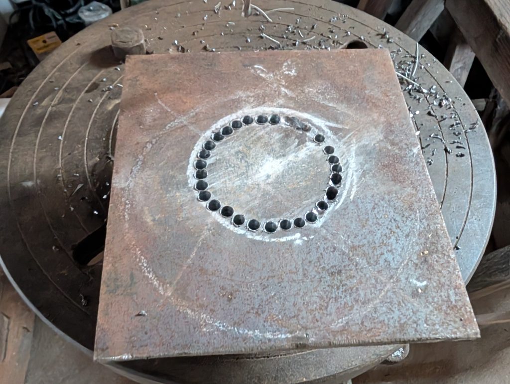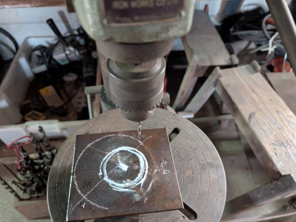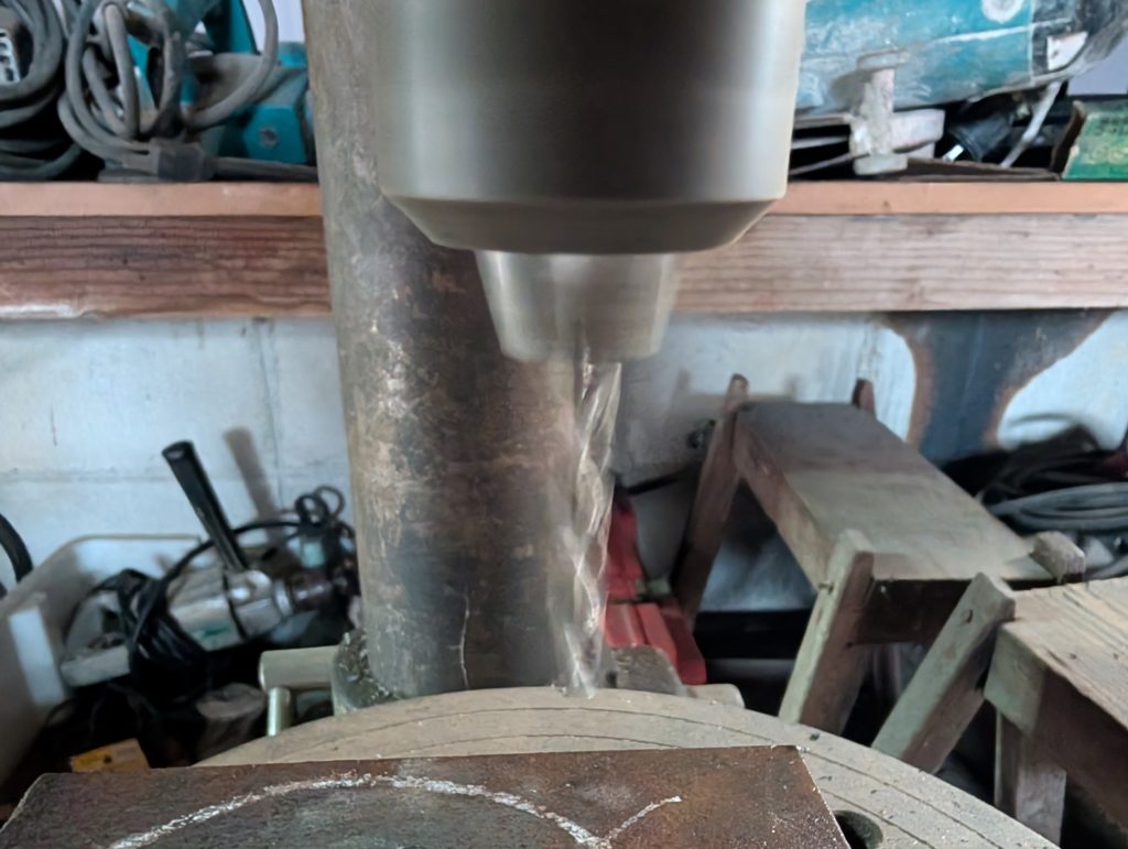 穴開けには、本当はガスの切断機を使いたいのですが、ガス切れで仕方なくポール盤で円形に穴を開けていく(地道な作業)