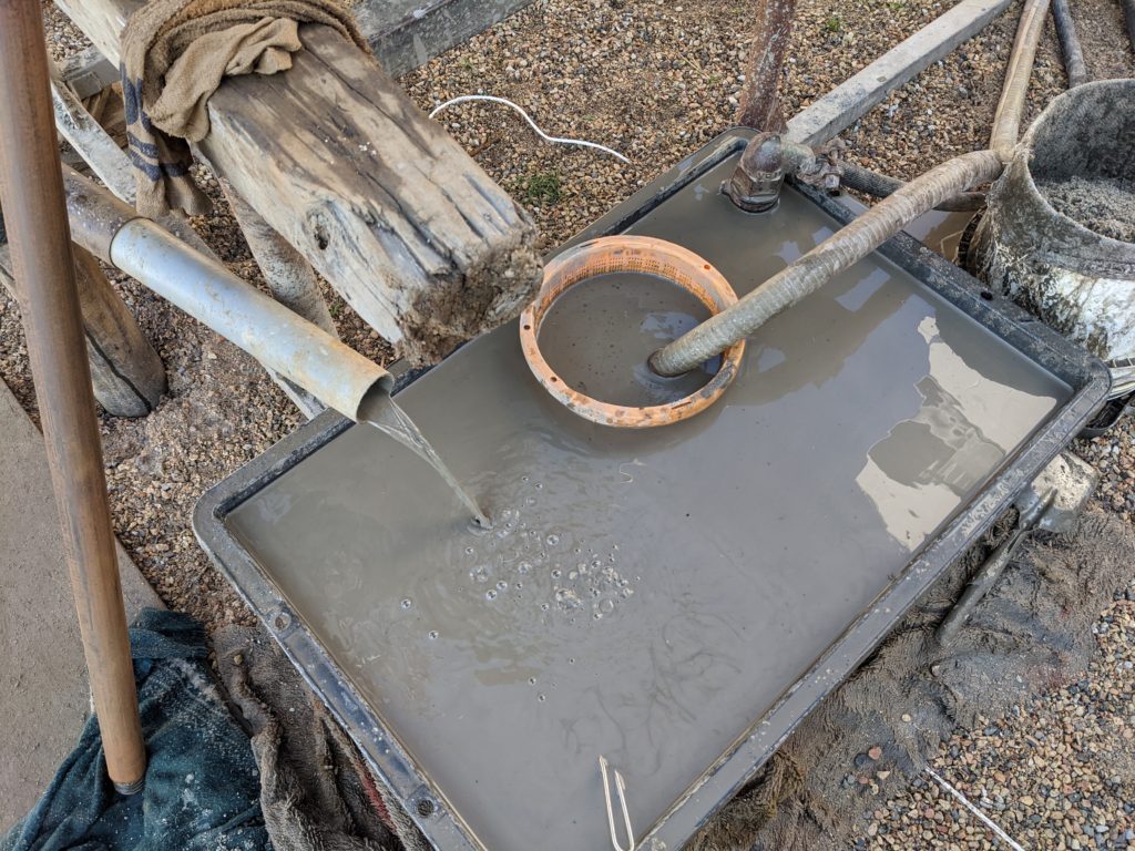 スライム排除する流れとして、送水した掘削用泥水がスライムを運搬しながら地上に揚がってこのプラ舟(黒い容器)に排出されます。