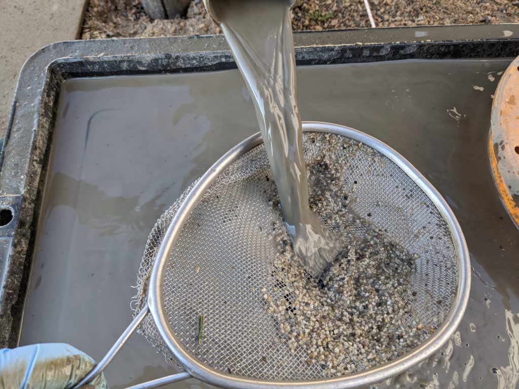 そしてプラ舟中に溜まったスライムを網ざるなどで取り、掘削用泥水中から排除します。