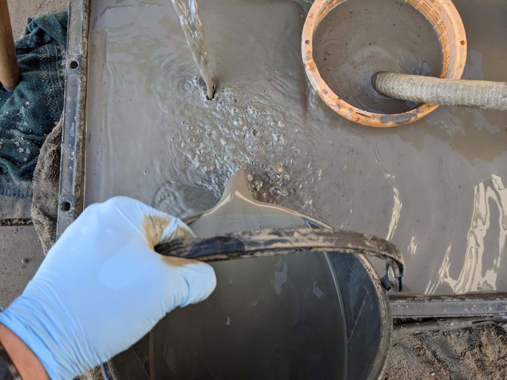 比重を高くした泥水を送り地上に揚がってきたら再度スライムの確認をする。