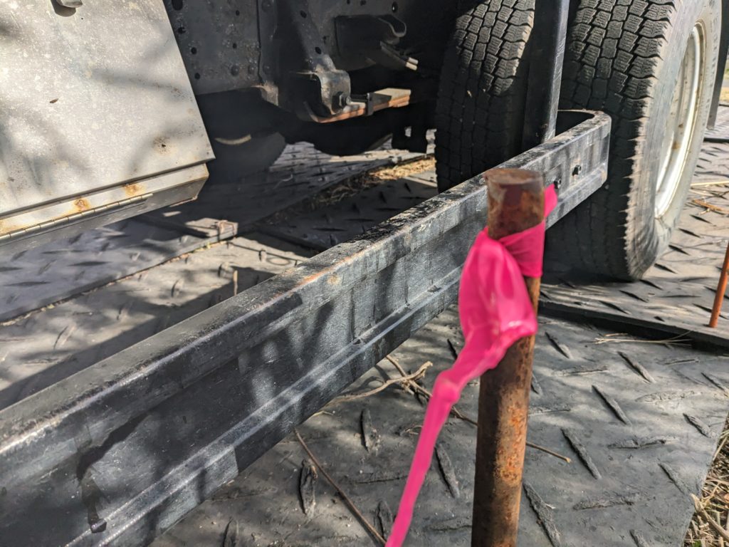 ひとつは、今回の現場でプラシキという敷板を資機材搬入場所に設置したのですが、プラシキが動かないように、会社倉庫にあったプラシキ固定用の穴にちょうど入る鉄棒を穴に打ち込むことにしました。