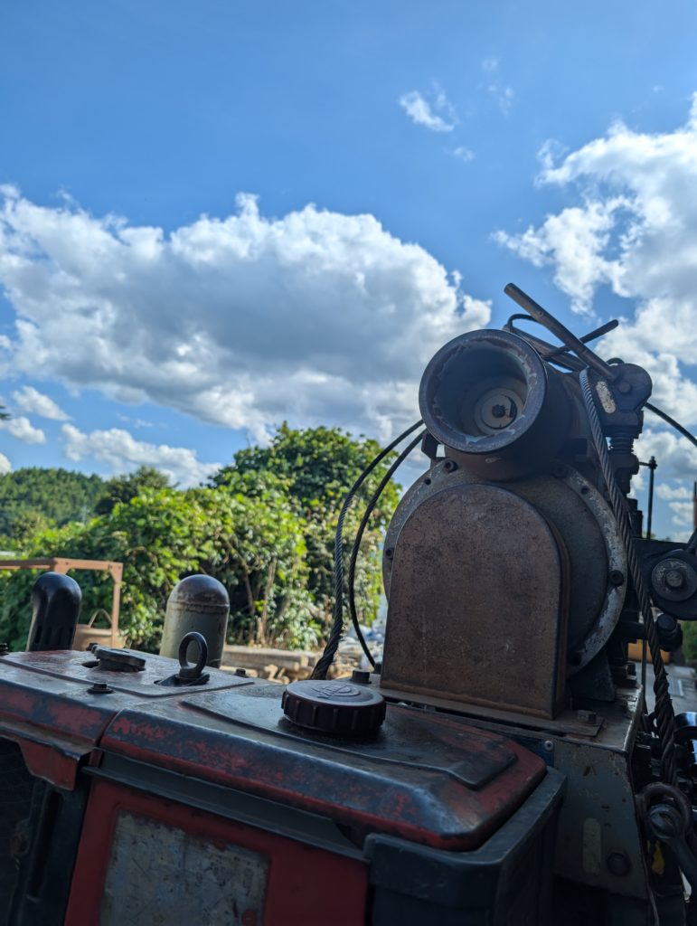 ケーシングを数本抜いて、マシンの周りの小道具を片付けてからマシンなどの重量物をユニックで吊り上げて積み込んで、残りの小道具を全て積み込みロープで縛って固定した。